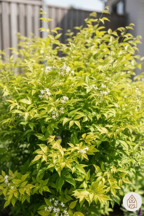 La Nandina domestica 'Lemon and Lime' produit des fleurs blanches. Cette couleur contraste joliment avec son feuillage vert lime, ajoutant une touche lumineuse au jardin.