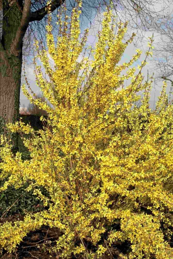 • La Forsythia intermedia 'Weekend' fleurit en mars et avril avec des fleurs jaunes éclatantes.
