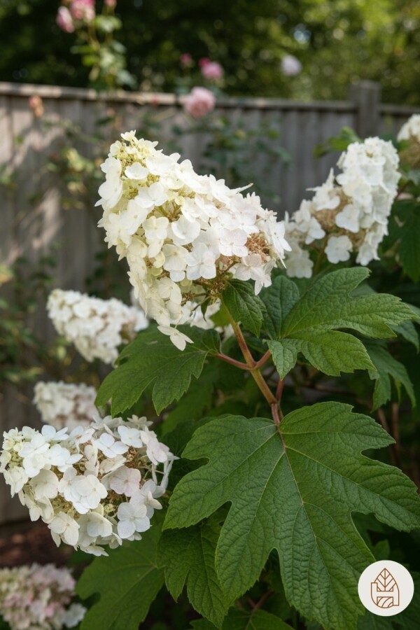 • Hydrangea quercifolia fleurit de juillet à septembre avec de grandes fleurs blanches qui deviennent roses. Ces fleurs attirent les abeilles et les papillons.