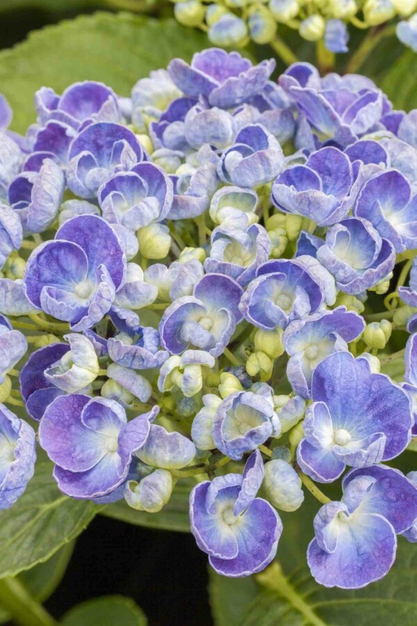 - La Hydrangea macrophylla 'Ayesha' fleurit de juillet à septembre avec des fleurs violettes en forme de cuillère, attirant les abeilles et les papillons.
