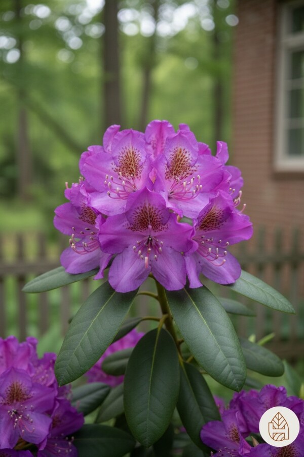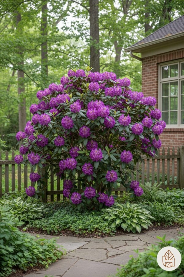 - Le Rhododendron 'Marcel Menard' fleurit en mai et juin avec des fleurs de couleur pourpre.